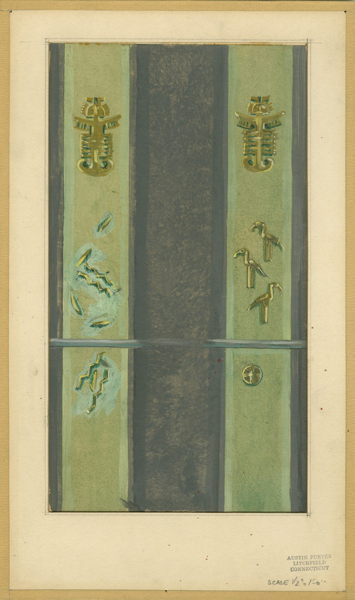 Painting on matboard of two green panels bordered by lighter gray and green strips against a gray background. The left and right panels depict several golden figures, some of which appear to be birds and snakes. The panels appear to mirror each other with the same two golden figures at the top of each panel with the animal figures below them placed at a similar height. There is a gray beam dividing up the lower half of the sketch. Written on the lower right hand corner of the mat board is written: "SCALE 1/2" = 1'-0"." On the back of the mat board is written in blue ink: "for S.U.M. Inc./Grace Line/Ship 2. Fwd Stairs/Sketch for proposed decoration/1958."
