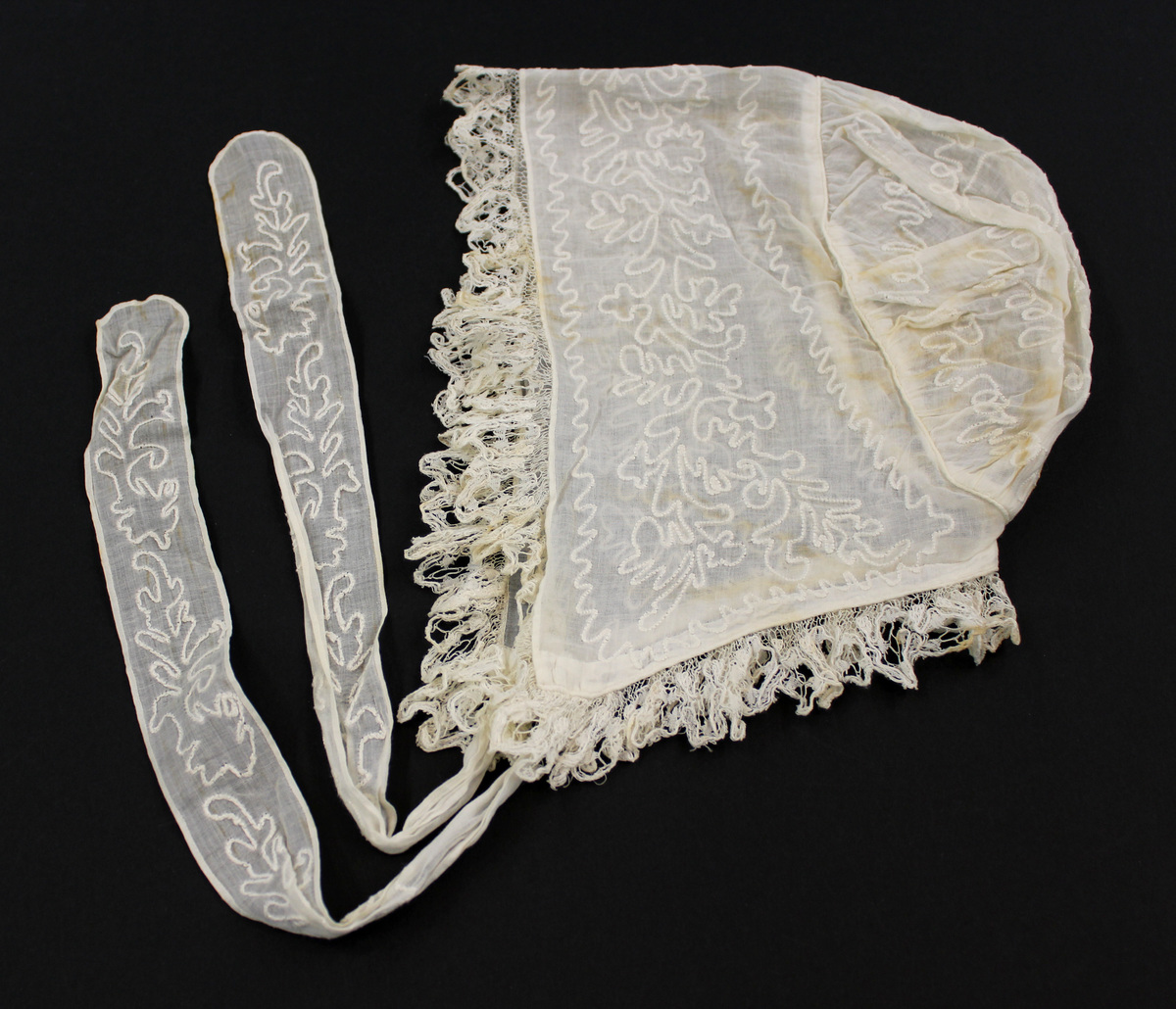 Off-white sheer cotton child's bonnet; embroidery; gathered back section; piping at seam; lace around front edge; embroidered fabric ties