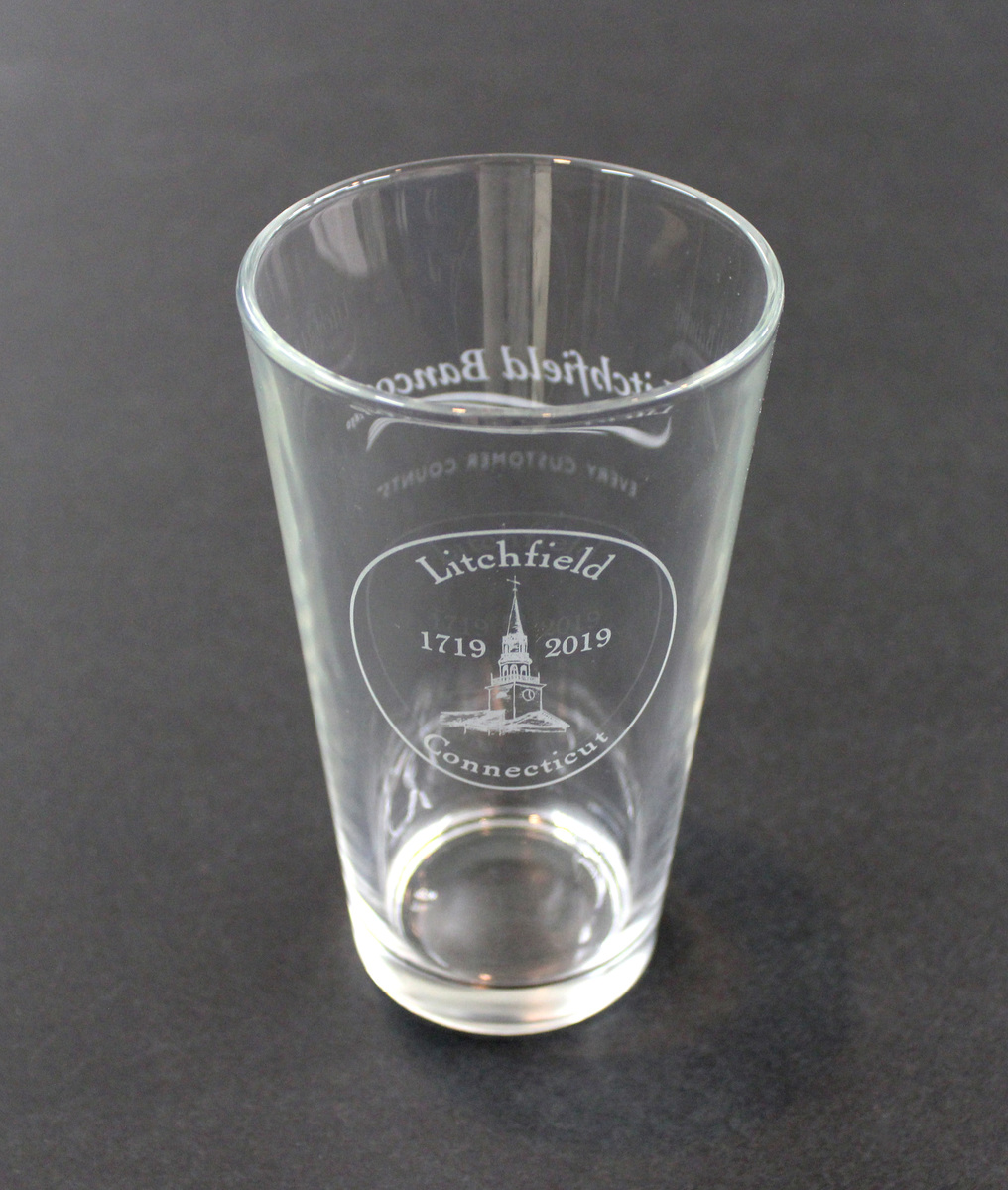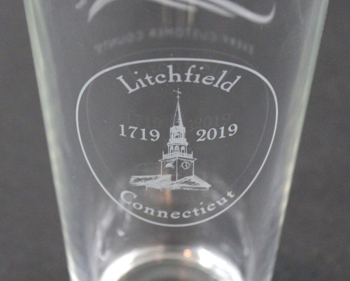 Commemorative glass produced for Litchfield's 300th Anniversary. Etched on one side is the 300th Anniversary logo: image of the First Congregational Church steeple with text, "Litchfield/1719/2019/Connecticut" set inside thin circle. Etched on reverse side is the logo for Litchfield Bancorp: text "Litchfield Bancorp/1850" above three curving lines, with text "EVERY CUSTOMER COUNTS" underneath.