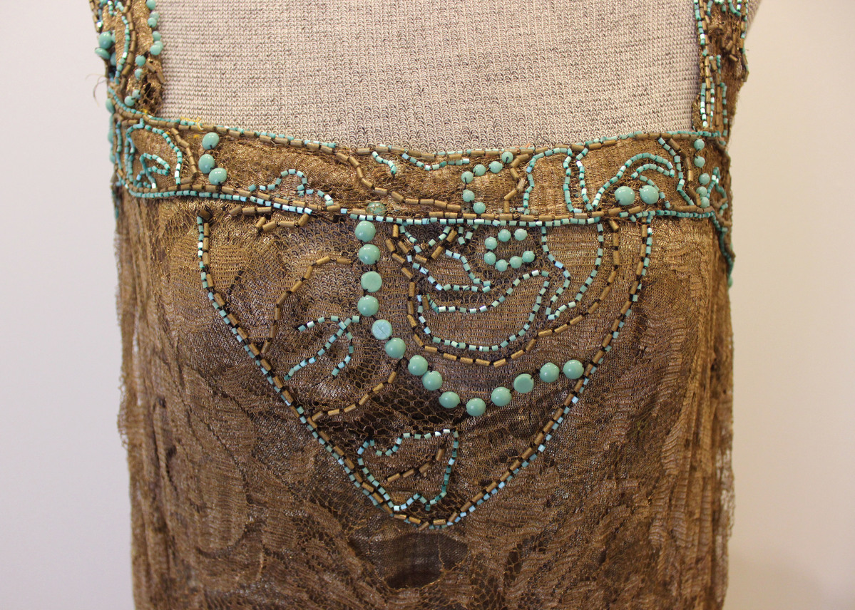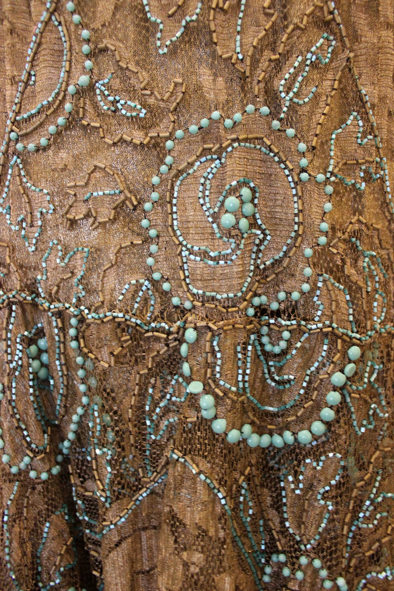 Bronze-colored, flapper-style lace dress. Sleeveless dress with square neckline and wide straps. Turquoise and tan beads in elaborate floral design on top and skirt. Narrow mink (?) fur trim at hem.