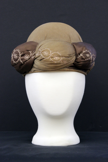Shallow bowl shaped Masonic ceremonial hat. Stiff, round topped hat covered in a tan wool fabric and a brown silk fabric. Sides of round hat are decorated with six half oval bulbs that protrude from the sides. They are embroidered in cream with a stylized wire pattern. Inside lined with red satin and stamped "THE / M.C. LILLEY / & CO. / COLUMBUS / OHIO" in silver. Inner band lined with a 2" leather strip, 21" in circumference.