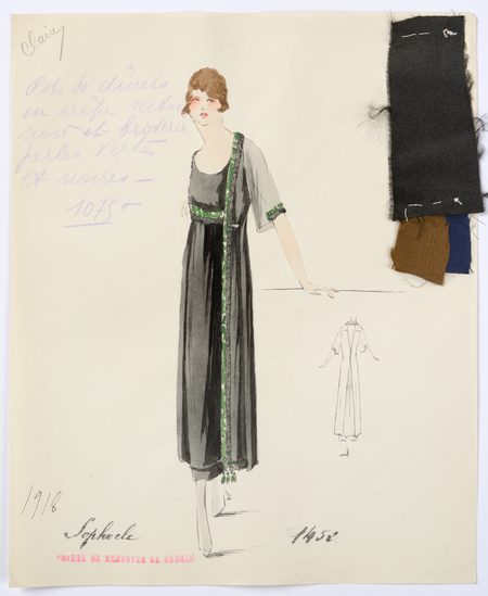 Lithograph and watercolor on paper fashion design. Dinner dress in black satin crepe. Embroidered with green and black pearls. Fabric samples accompany rendering.