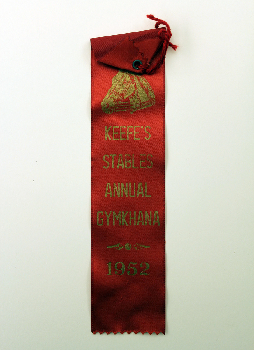 Red satin ribbon with triangular fold and metal eyelet at top. Printed on one side in gold ink is image of a horse's head with lettering, "KEEFE'S/STABLES/ANNUAL/GYMKHANA/1952." Red thread strung through eyelet.
