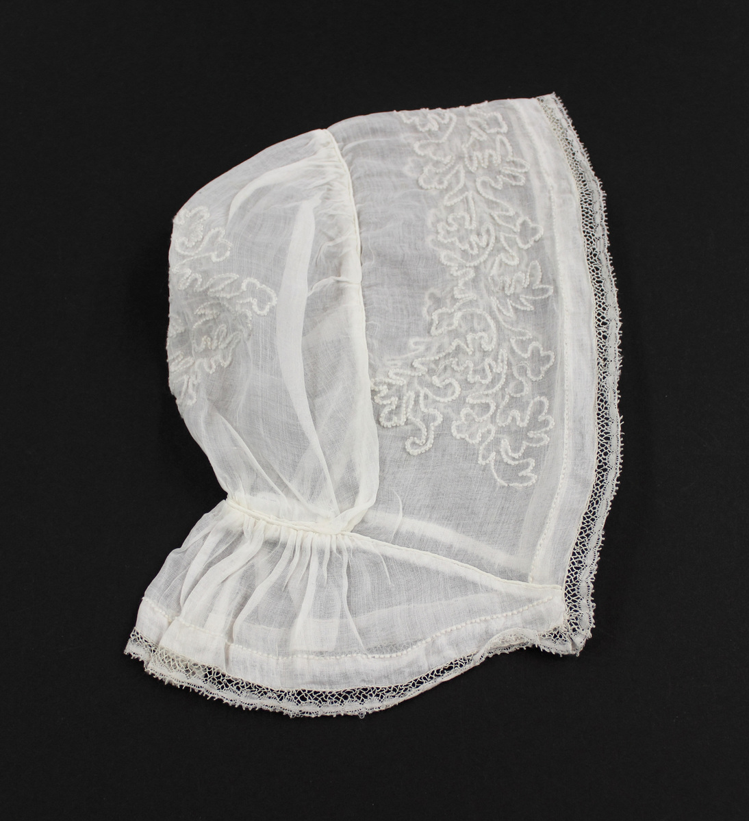 White sheer cotton child's bonnet; lace at front and neck; embroidery at front and back; gathered back section with piping at seams; neck ruffle