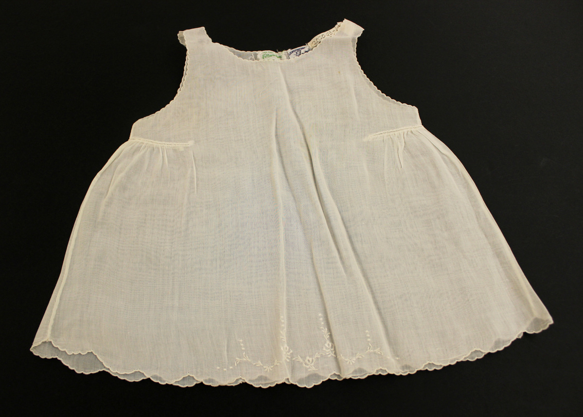 White cotton children's full slip. Boat neck with scalloped embroidery at neck, armholes, and scalloped hem. Side gathers. Embroidered flowers at center-front hem. Left side opening with pearl button. Two woven labels are center-back, "HAND MADE/FELTMAN BROS." and "LILIPUTIAN BAZAAR/TRADEMARK/BEST & CO."
