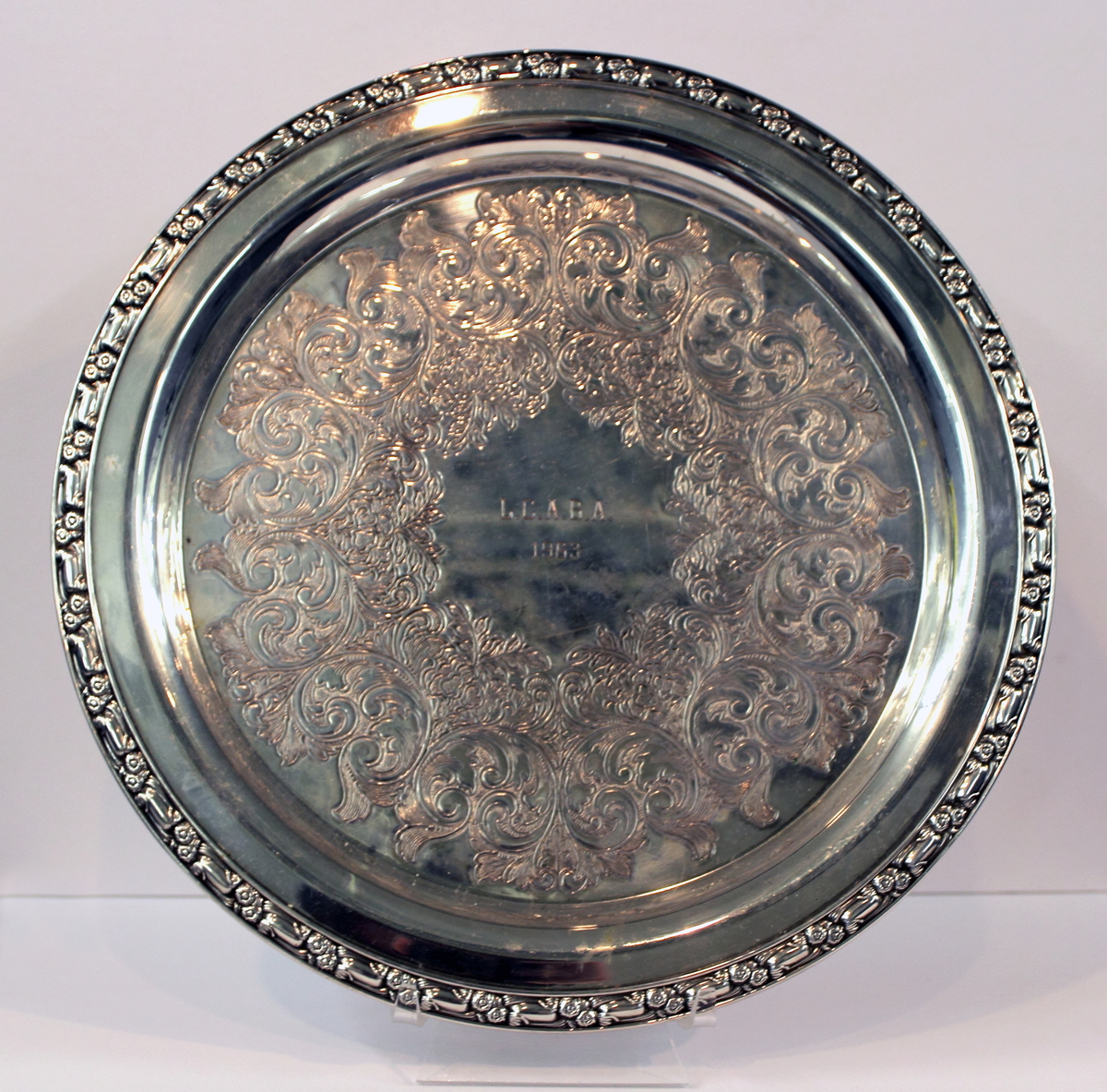 Award platter given to Art Webster by the Litchfield County Agricultural Breeders Association. Round silverplated platter with shallow well and narrow rim. Well is decorated with a thick ring of engraved Rococo-style motifs, including scrolls and acanthus leaves; engraved at center, "L.C.A.B.A./1963." Thin band of impressed floral decoration around outside of rim. Engraved mark on bottom, "ONEIDA/SILVERSMITHS."