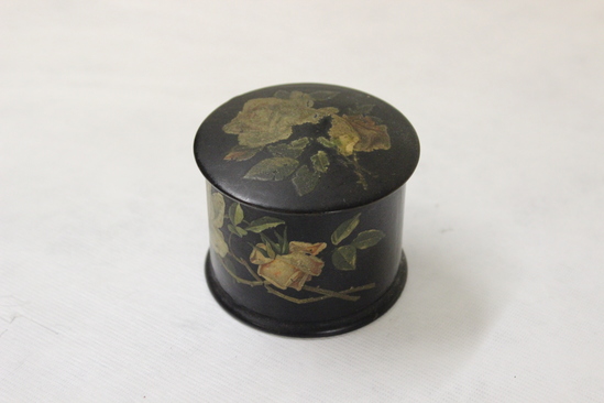 A - Circular, black plastic powder box with floral decoupage decoration on exterior. Remnants of powder and puff inside. B - Black plastic lid for powder box with decoupage decoration.