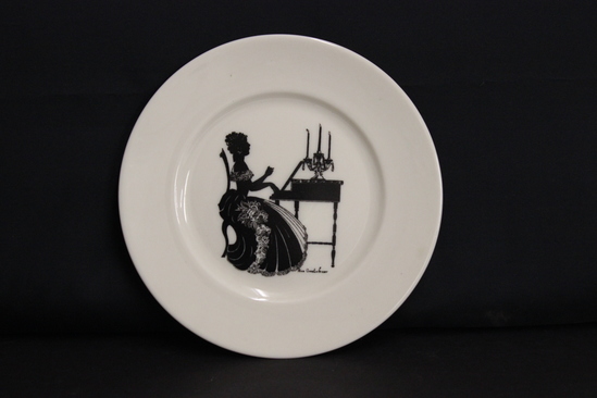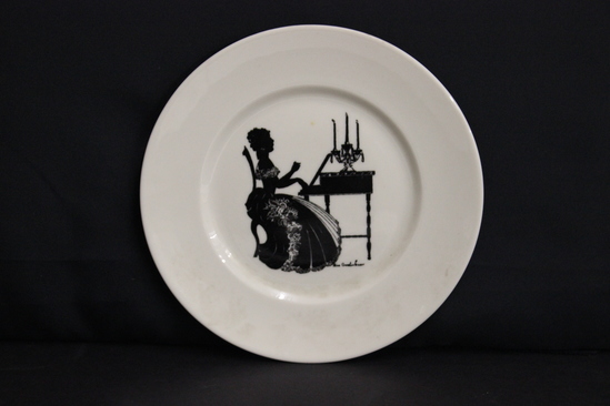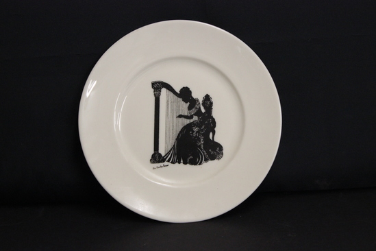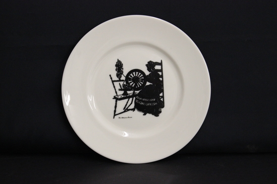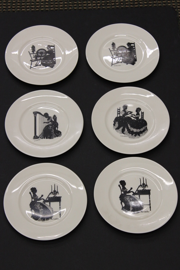 Six dessert plates designed by Alice Cranston Fenner. All are cream color porcelain plates with a transfer motif in black silhouette. A - Woman seated in ladderback chair at spinning wheel. B - Woman seated in ladderback chair at spinning wheel. C - Two women, seated facing one another, having tea. D - Women, seated, playing the harp. E - Woman, seated, playing the harpsichord with candelabra on top. F - Woman, seated, playing the harpsichord with candelabra on top.