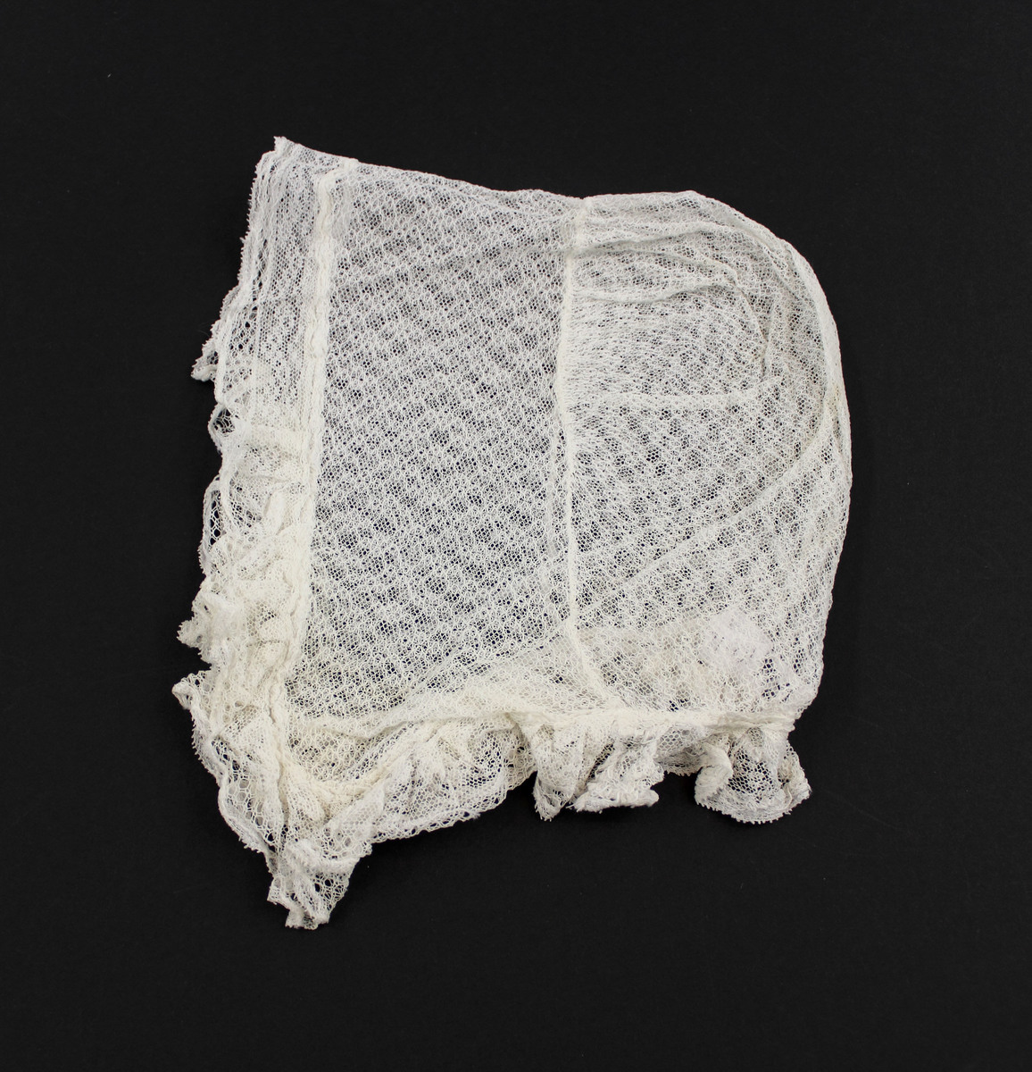 White cotton net lace child's bonnet; lace ruffle around front and neck; gathered back section; extended tips on sides
