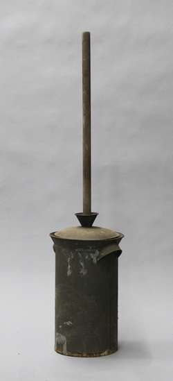 Tin butter churn with tin lid and wood agitator.