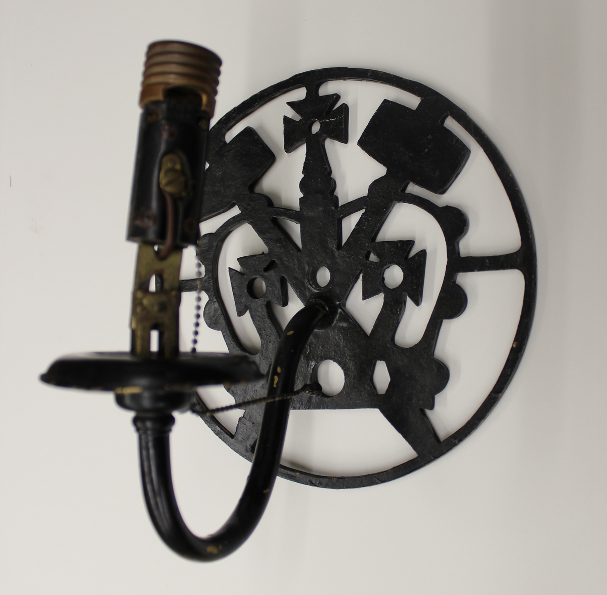 Pair of decorative sconces that formerly hung in the dining hall of Camp Columbia. Wrought iron backplate in the shape of the King's Crown, a symbol commonly associated with Columbia University. Arm extends from the middle of the crown, terminating in a metal basin and candelabra socket. Electrical wiring runs through the arm and out of the backplate.