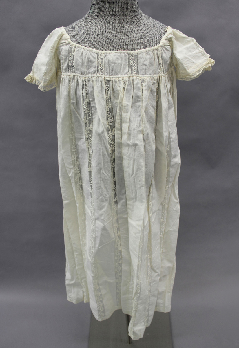 White cotton child's dress; square neckline; long sleeves with lace edge; short bodice with front drawstrings; vertical lace insertions on sleeves, bodice and skirt; center back opening all the way down with drawstrings