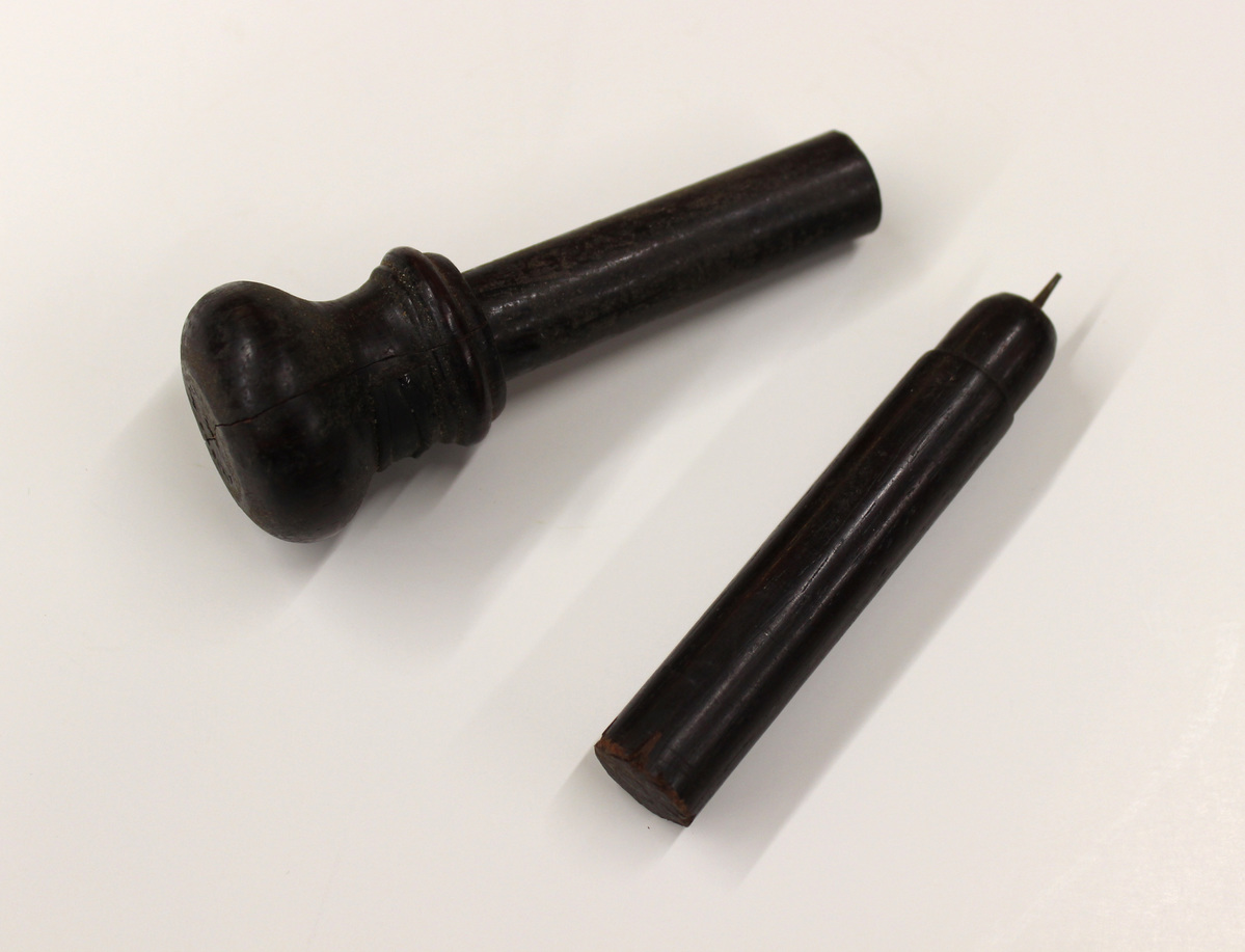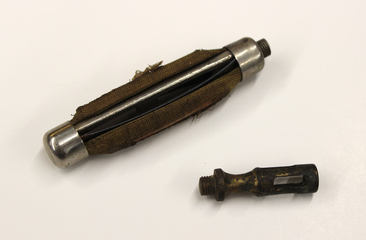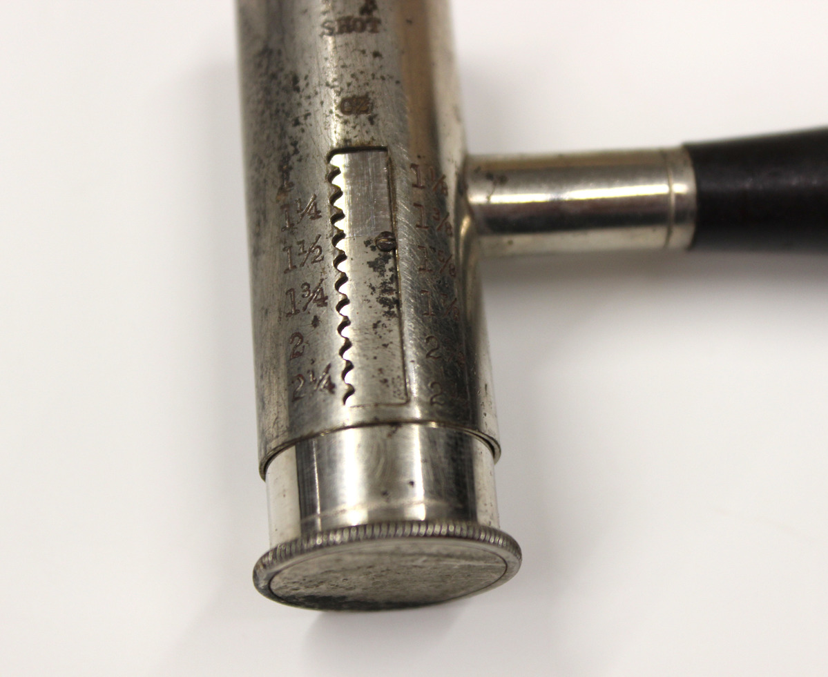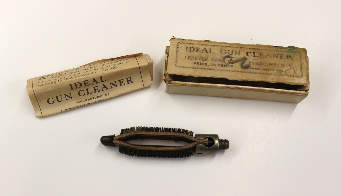 Grouping of shell reloading tools and shotgun cleaning tools. B: Powder and shot measure. Turned wood handle attached to metal cylinder. One side of cylinder marked "POWDER/DRAMS" with number 2 3/4 to 5 1/2 arranged vertically in 1/4 increments. Reverse side is marked "SHOT/OZ" with numbers 1 to 2 3/8 in 1/8 increments. Inner metal cylinder is adjustable up or down to allow for measuring different amounts, with small nail heads visible on outer cylinder to mark measurement. C: Loading tube, silver metal, flared at one end. Marked "BRIDGEPORT/G I CO/1149/14." D: Loading tube, brass, flared at one end. Marked "BRIDGEPORT/G I CO/1149/16." E: De-capping or de-priming base. Circular wooden base with small hole through middle. F: Recapping or re-priming tool. Nutcracker style with hinged handles. Circular opening on one handle, raised knob on the other. G: Turned wood knob, forms handle for rod used to press shells. Opening drilled on one side. Split in two pieces. H,I: Turned wood dowels, tapering at one end where a thin metal point is inserted. Used for removing primers from shell casings (with e) or for pressing powder in reloaded shells (with g). J: Gun cleaning attachment. Metal ends, one threaded, with strips of cardboard and metal running between them; cardboard has metal wire teeth facing outwards. In cardboard box labeled "IDEAL GUN CLEANER/LEFEVER ARMS CO./SYRACUSE, N.Y." Instruction sheet included. K: Gun cleaning attachment. Metal ends, one threaded, with wood and metal strips running between them; wood covered in fine metal mesh. L: Gun cleaning attachment, threaded at one end.
