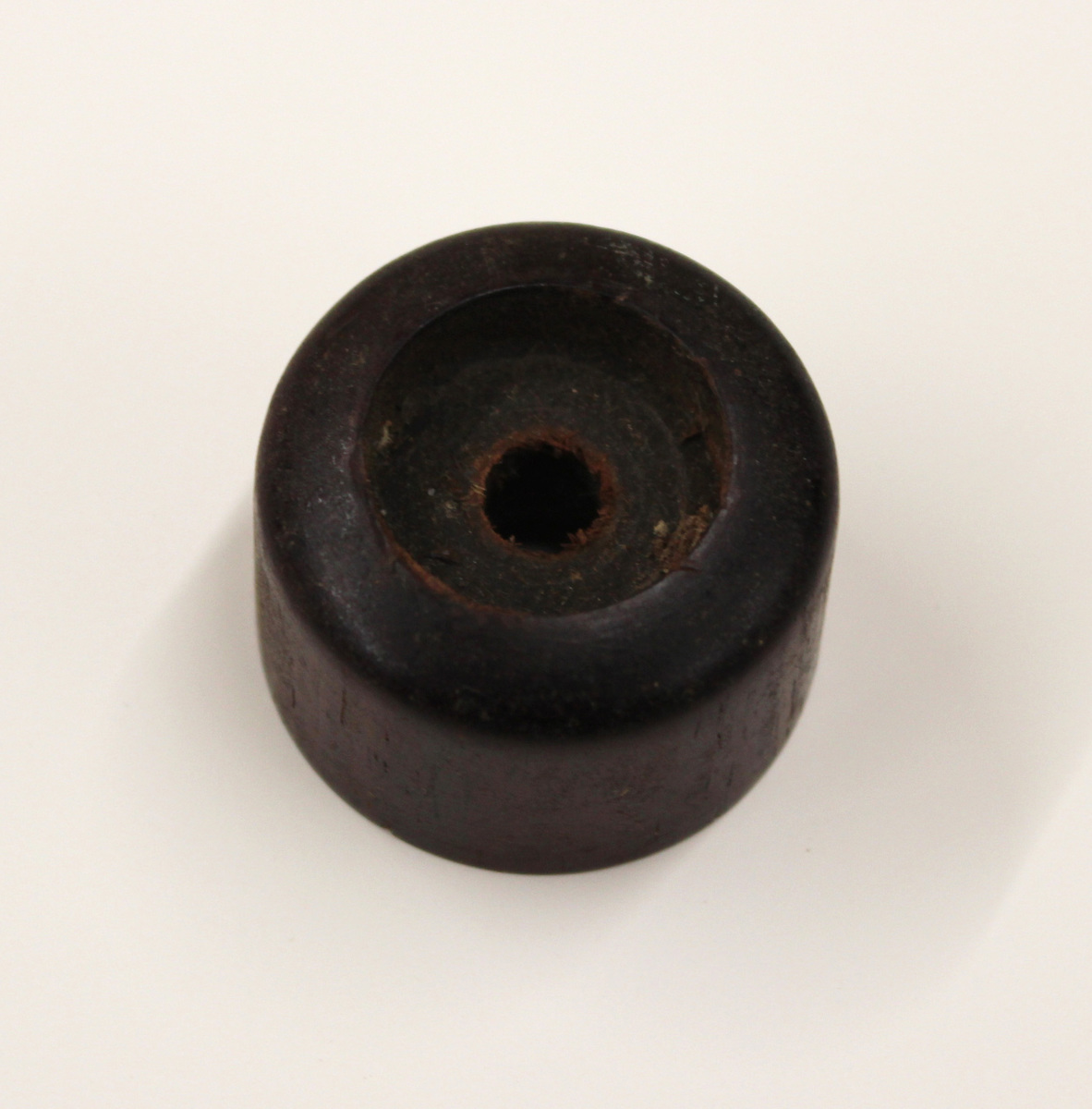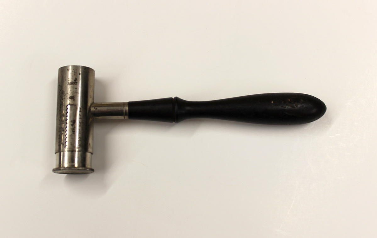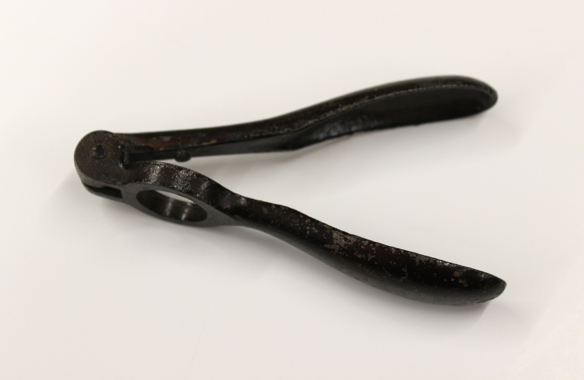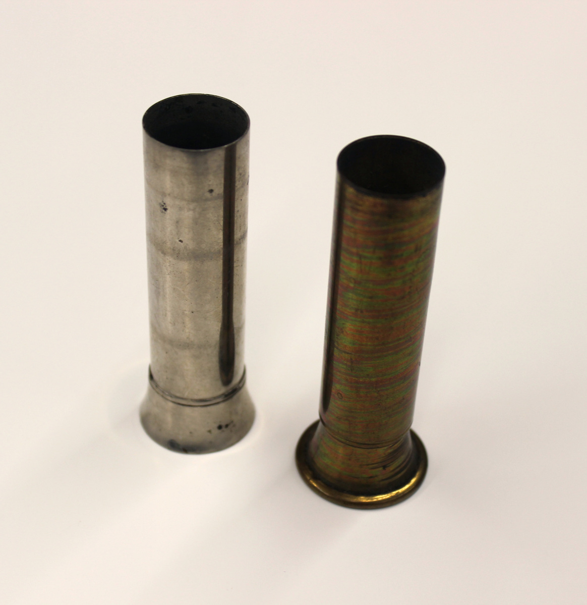 Grouping of shell reloading tools and shotgun cleaning tools. B: Powder and shot measure. Turned wood handle attached to metal cylinder. One side of cylinder marked "POWDER/DRAMS" with number 2 3/4 to 5 1/2 arranged vertically in 1/4 increments. Reverse side is marked "SHOT/OZ" with numbers 1 to 2 3/8 in 1/8 increments. Inner metal cylinder is adjustable up or down to allow for measuring different amounts, with small nail heads visible on outer cylinder to mark measurement. C: Loading tube, silver metal, flared at one end. Marked "BRIDGEPORT/G I CO/1149/14." D: Loading tube, brass, flared at one end. Marked "BRIDGEPORT/G I CO/1149/16." E: De-capping or de-priming base. Circular wooden base with small hole through middle. F: Recapping or re-priming tool. Nutcracker style with hinged handles. Circular opening on one handle, raised knob on the other. G: Turned wood knob, forms handle for rod used to press shells. Opening drilled on one side. Split in two pieces. H,I: Turned wood dowels, tapering at one end where a thin metal point is inserted. Used for removing primers from shell casings (with e) or for pressing powder in reloaded shells (with g). J: Gun cleaning attachment. Metal ends, one threaded, with strips of cardboard and metal running between them; cardboard has metal wire teeth facing outwards. In cardboard box labeled "IDEAL GUN CLEANER/LEFEVER ARMS CO./SYRACUSE, N.Y." Instruction sheet included. K: Gun cleaning attachment. Metal ends, one threaded, with wood and metal strips running between them; wood covered in fine metal mesh. L: Gun cleaning attachment, threaded at one end.