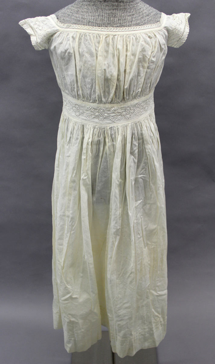 White cotton child's dress; straight neckline with eyelet lace trim; short sleeves with white work embroidery; gathered bodice; waistband of eyelet lace; gathered skirt; tucks at hem; drawstrings at center back; all hand-stitched