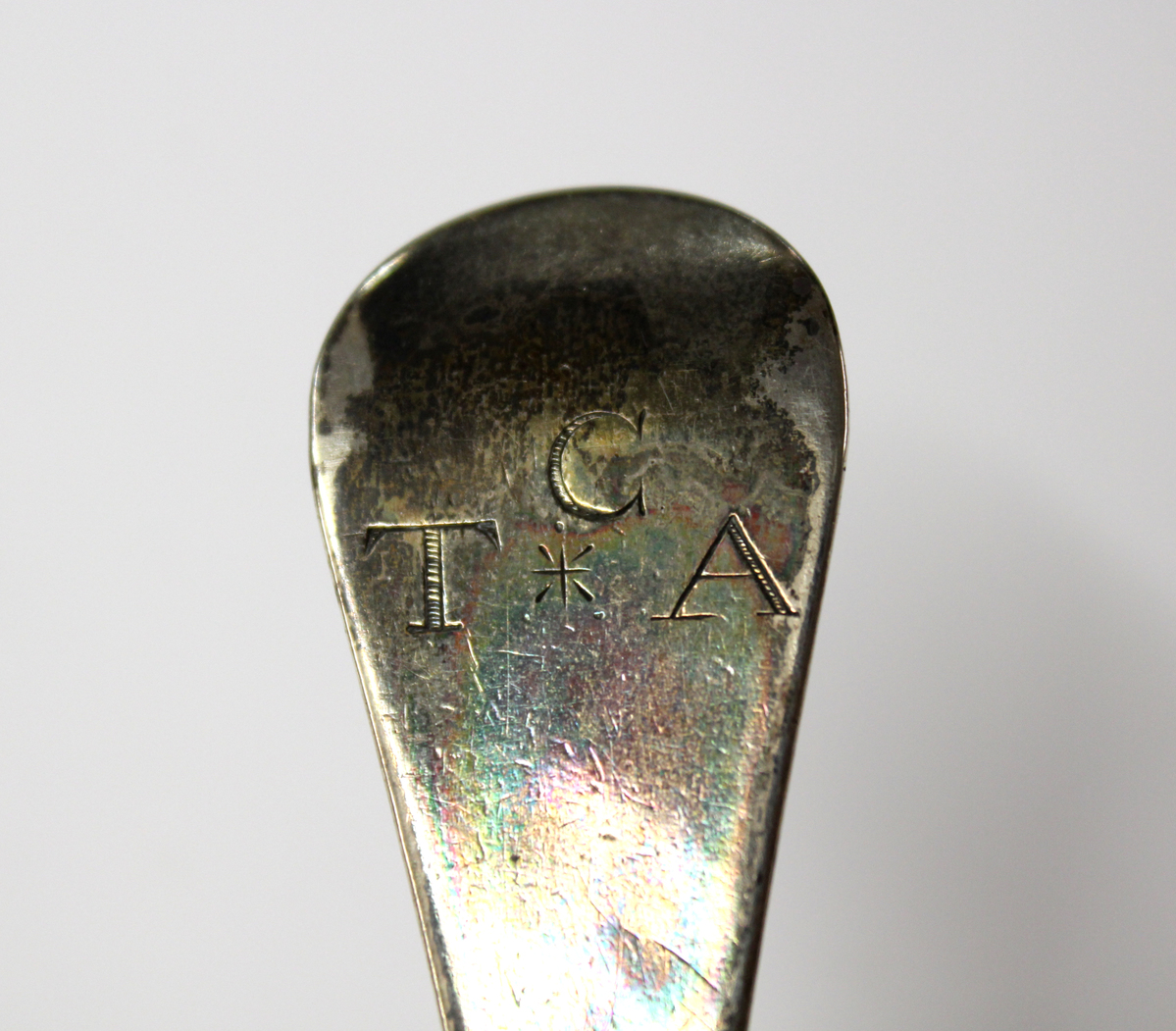 Handwritten note, copied from "Grandma Catlin's" book, describes the object as one of the "silver spoons belonging to Thomas Catlin, Jr., Tru's great grandfather, said to have been made from eighteen silver dollars. Lt. Thomas Catlin, Jr. was taken prisoner at New York in 1777. His wife was Avis Buell and they were married on December 25, 1763."