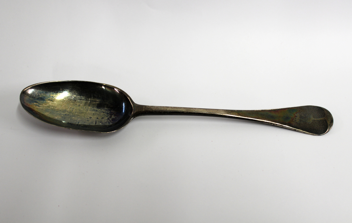 Serving spoon made by Miles Beach, a Litchfield silversmith, for Thomas Catlin, Jr. Silver spoon with deep, oblong bowl and narrow stem that widens toward handle. Rounded terminal, curving upward. Engraved on back of handle, "T/C/A"; maker's mark on back of stem, "M.BEACH" in rectangular stamp.