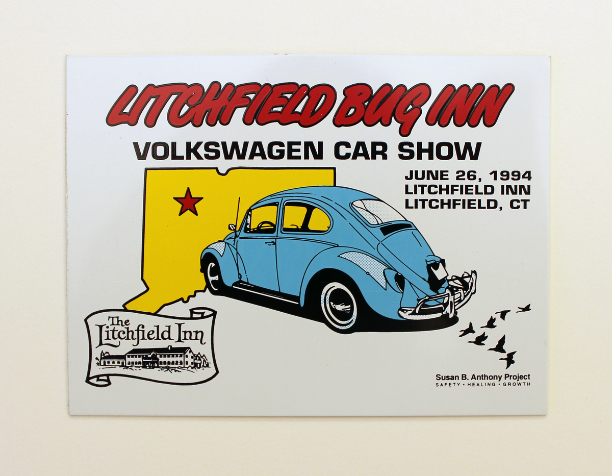 Rectangular plaque, aluminum with printer graphic on one side and adhesive sheet on reverse. White background with red lettering, "LITCHFIELD BUG IN," outlined in black. Below in black lettering, "VOLKSWAGEN CAR SHOW." Logo for the Litchfield Inn in the lower-left. At the center is a yellow outline of the state of Connecticut with a red star positioned over the town of Litchfield, with a light blue Volkswagen Beetle. Black lettering to the right, "JUNE 26, 1994/LITCHFIELD INN/LITCHFIELD, CT." At lower-right is the logo for the Susan B. Anthony Project, presumably the beneficiary of the event.