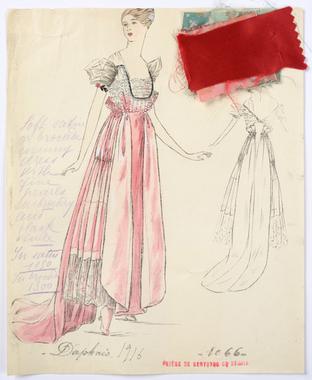 Lithograph and watercolor on paper fashion design. Soft satin evening dress with delicate pearl embroidery and black tulle. Fabric samples accompany rendering.