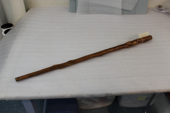 Cane from one piece of thick wood, slightly tapered shaft, knots throughout, stained and varnished, tip missing.