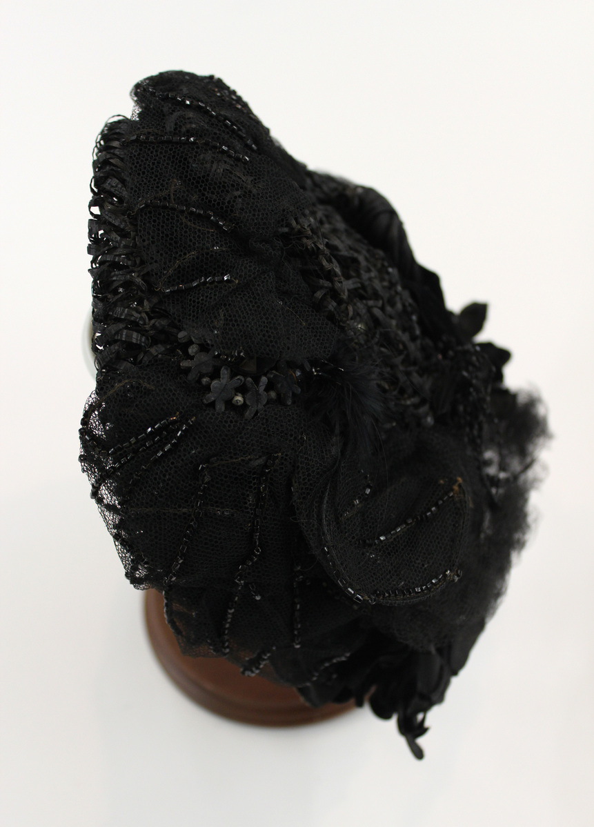 Black silk women's bonnet; netting, jet beads, flowers, feather, rafia and velvet ribbon bows; wired netting along front with gathered silk
