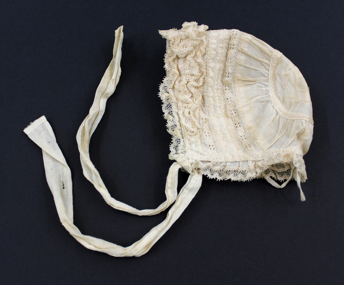Off-white cotton child's bonnet; white work embroidery; lace ruffle at front and neck; circle and embroidery at back; fabric ties
