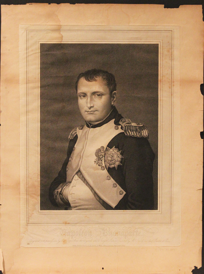 Engraving of a man in uniform from waist up, facing left. Subject is a younger gentleman with short, dark hair. Man is wearing a military jacket with medals on the breast of the jacket and epaulets on shoulders. His right hand is tucked inside the front of his jacket. "Napoleon Buonaporte" written in script below composition.
