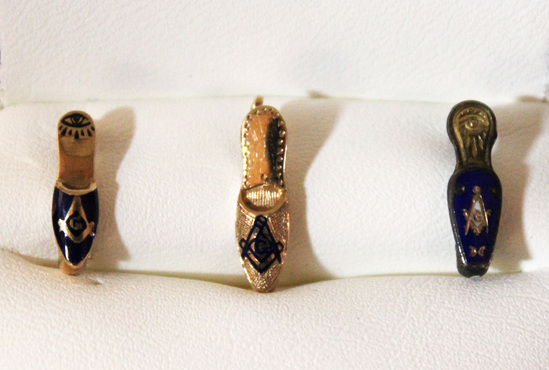 Three Masonic Blue Slipper pins. Each pin made of gold and shaped like a slipper. The upper portion of each slipper decorated with the image of the square and compass. Two of the slippers are decorated on the heel with an image of the Masonic all seeing eye. Pins stored in a small black leather, oval shaped jewelry case.