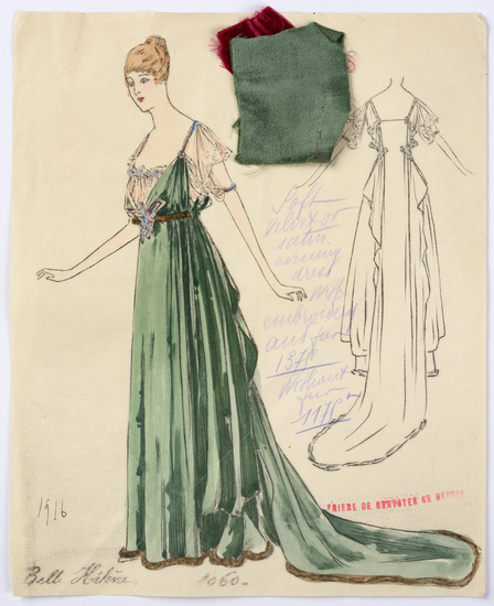 Lithograph and watercolor on paper fashion design. Soft velvet or satin evening dress with embroidery and fur. Fabric samples accompany rendering.