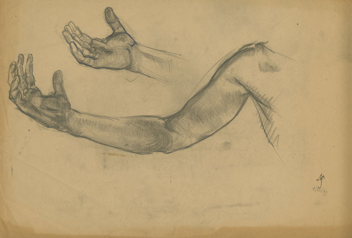 Pencil and ink sketch on paper of two right hands and upper arm. right hands are depicted with their fingers curled upwards. One of the right hands is attached to an outstretched arm that is completed up to the shoulder. The second right hand is sketched directly above the first hand in the upper left corner of the paper. Initialed in bottom right corner and dated "4/22/49". The piece of paper on which the sketch is drawn is folded in half, with the sketch on one half of the paper. On the back of the sketch underneath the fold is written in black ink: "Study for arms + hands of Christ./A Purves 1949/Honesdale."