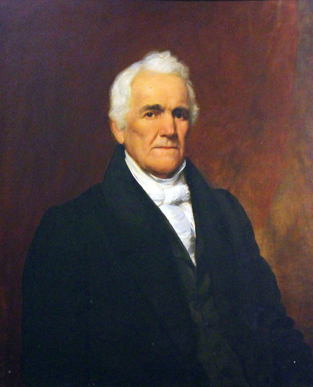 Oil on board portrait of Homer Boardman of New Milford, CT. The sitter is an older gentleman with white hair and is wearing a dark suit with vest, white collard shirt and white necktie. Background of portrait is a very deep red - possibly mean to represent a certain pulled behind the sitter. The portrait is unsigned, but has been attributed to Waldo and Jewett.