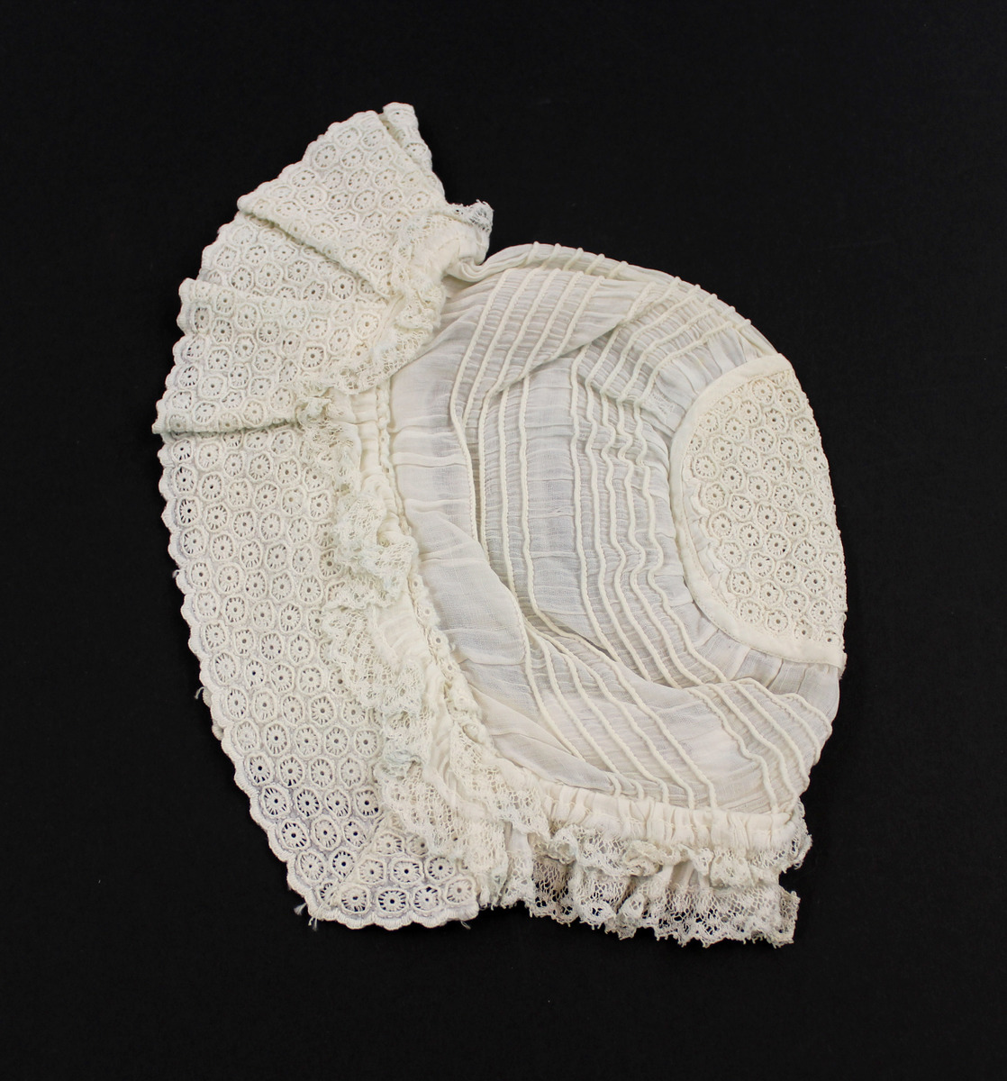 Off-white sheer cotton child's bonnet; eyelet lace ruffle at front; lace ruffle at front and neck; multiple tucks; eyelet lace circular section at crown