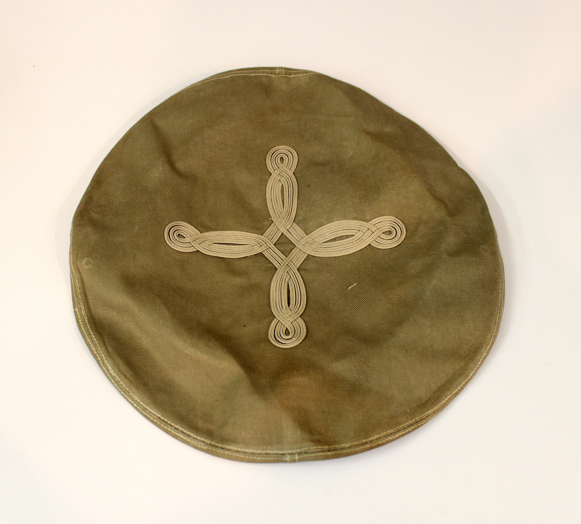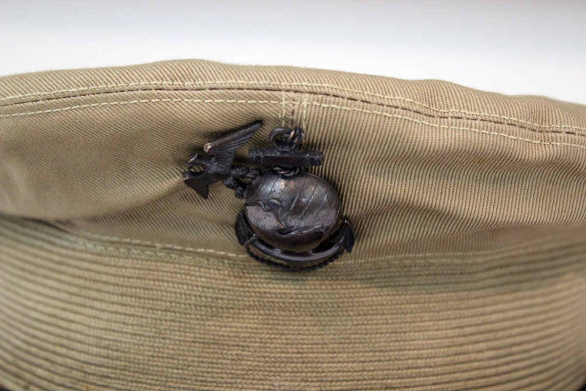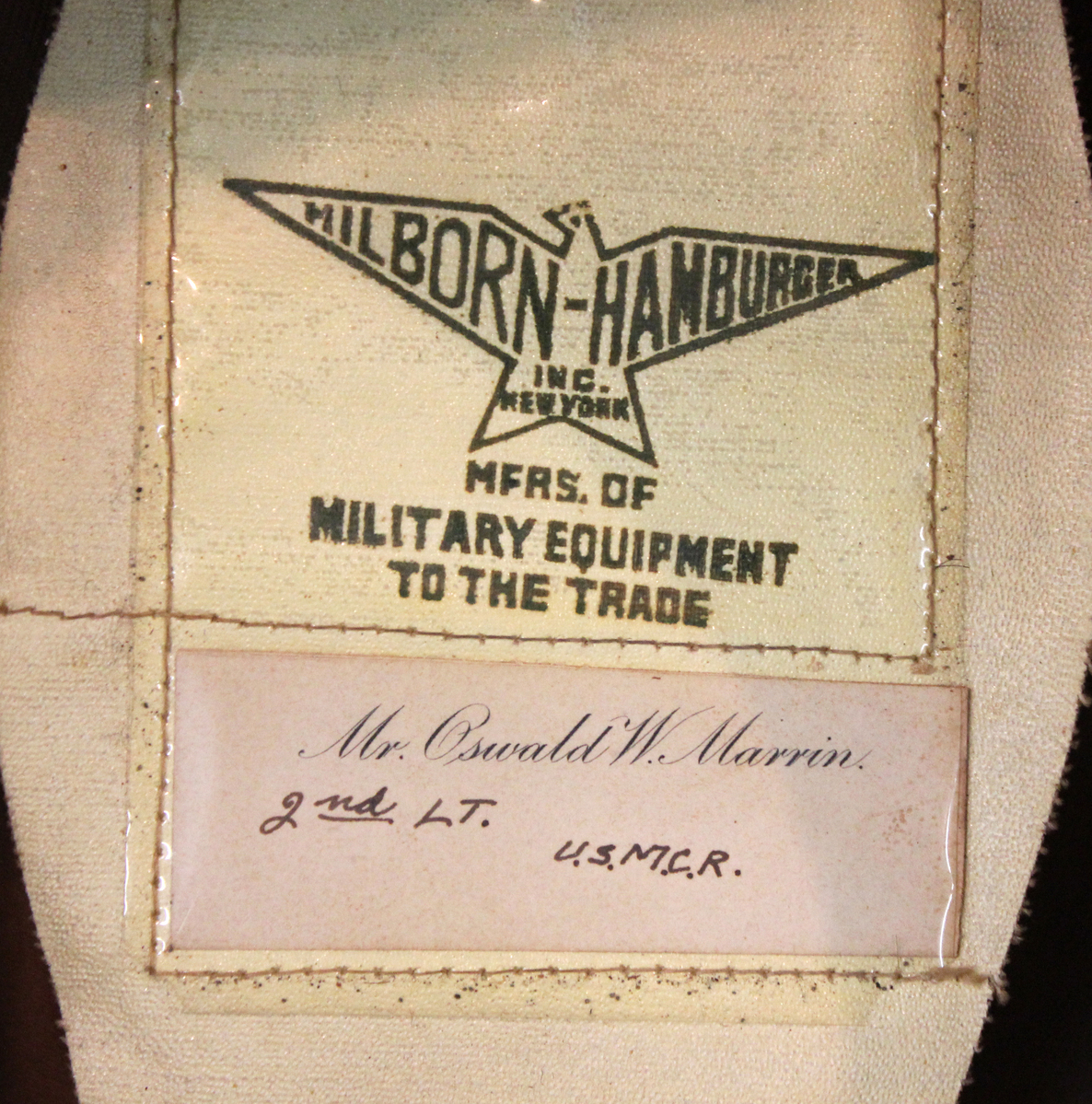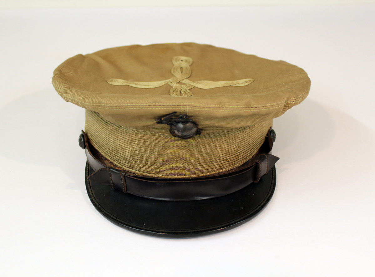 A - Khaki cotton twill peaked military cap, World War II era. Black leather visor, black leather belt with two USMC buttons. Soutache braid design on top of cap. Knit braid above visor. USMC pin attached at center front. Interior brown leather band and oil cloth label with eagle image and lettering "MILBORN-HAMBURGER/INC./NEW YORK/MFRS. OF/MILITARY EQUIPMENT/TO THE TRADE." Name card inserted, "Mr. Oswald W. Marrin/2nd LT./U.S.M.C.R." B - Khaki cotton twill cover, matching cover on A.