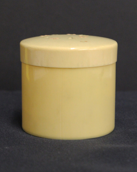 Yellow plastic cylindrical hair receiver with slightly domed lid decorated, asymmetrically, with pink and green 5-petal flowers. Inside the hair receiver is a blond curl, cut from the hair of two year old Oswald W. Marrin Jr. in 1921 by his mother, Jean Fyfe Marrin.
