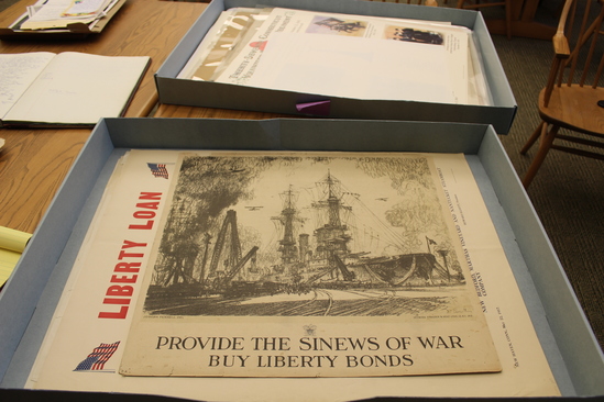 World War I era poster depicting a shipyard with two-masted vessel at port, plane in the air, cranes, billowing smoke, and railroad tracks. Black charcoal print with block letter at bottom that reads, "PROVIDE THE SINEWS OF WAR/ BUY LIBERTY BONDS." Crest with eagle above the world "sinews."