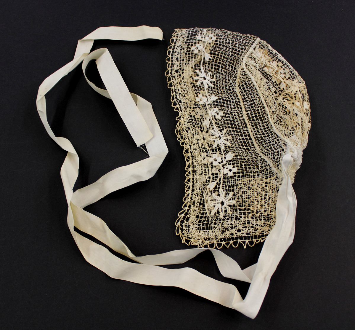 Tan cotton filet net child's bonnet; blue embroidered flowers; extended sides; scalloped edges; fabric ties gathered at center back