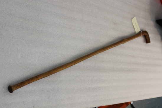 Cane of blonde wood. Shaft, tip, and top of handle are of one piece of wood. The upper part of the shaft leading into the handle is octagonal. The tip splays at the bottom and is rounded at the end. The handle is also rectangular and is glued to the shaft.