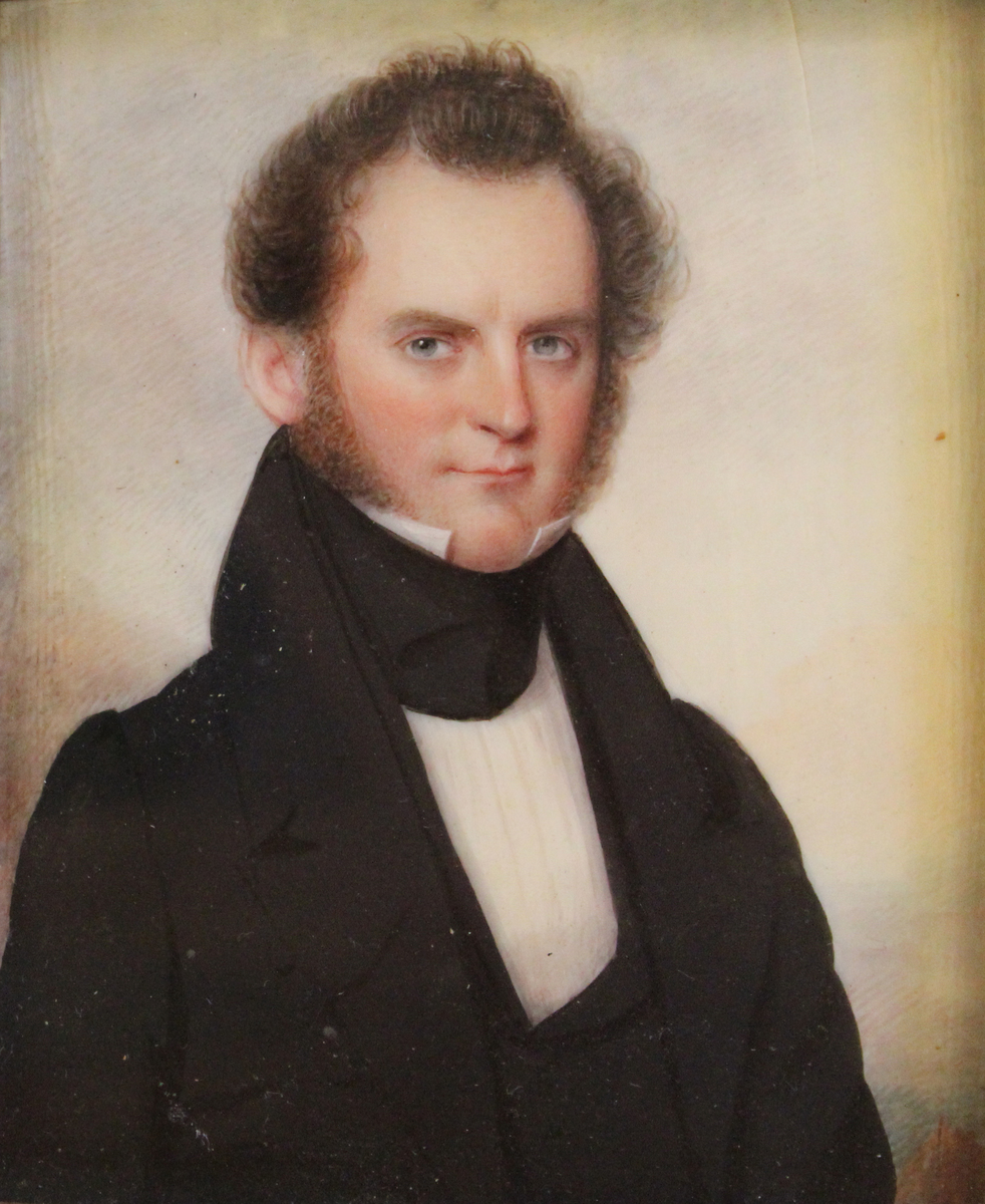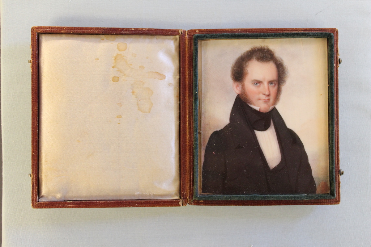 Watercolor on ivory portrait miniature of A. J. Moore, husband of Susan Moore, by Anson Dickinson. Bust portrait of man wearing blue jacket with black vest, white shirt, and a black cravat. The man has brown curly hair with sideburns and blue eyes. Facing front right against a background of white, blue, grey, brown, and red. Square portrait set in red tooled leather album case with gilt border and hook clasps. The inside of the case is lined with white silk and has a green velvet binder around square glass. Unrelated invitation used as filling at rear of miniature.