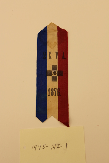 G.A.R. ribbon. Red, white and blue striped grosgrain with black printing: "2 C.V.A. / (cross with a number 2 at center) / 1876." Pointed top with inverted V bottom.