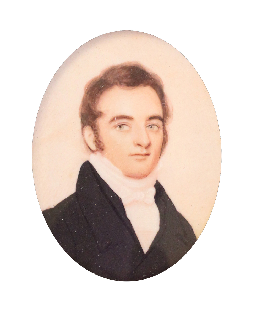 Watercolor on ivory portrait miniature of Theodore M. Moore by Anson Dickinson. Bust portrait of a young man wearing a black coat, white shirt with high collar, and white stock tied in a bow. The man has reddish brown hair with grey or light blue eyes (likely faded). Facing front right against a background of white and tan. Oval portrait in square frame with concave oval center and gold bevel. Portrait is under convex glass and is held in the frame by metal tabs on rear. Trade card on verso of portrait, printed "A. Dickinson/MINIATURE PAINTER/222 Broad Way/New York" with small image of a young boy or cherub; written in ink "T. M. Moore" and in pencil "Theodore M. Moore/born 27th June 1798."