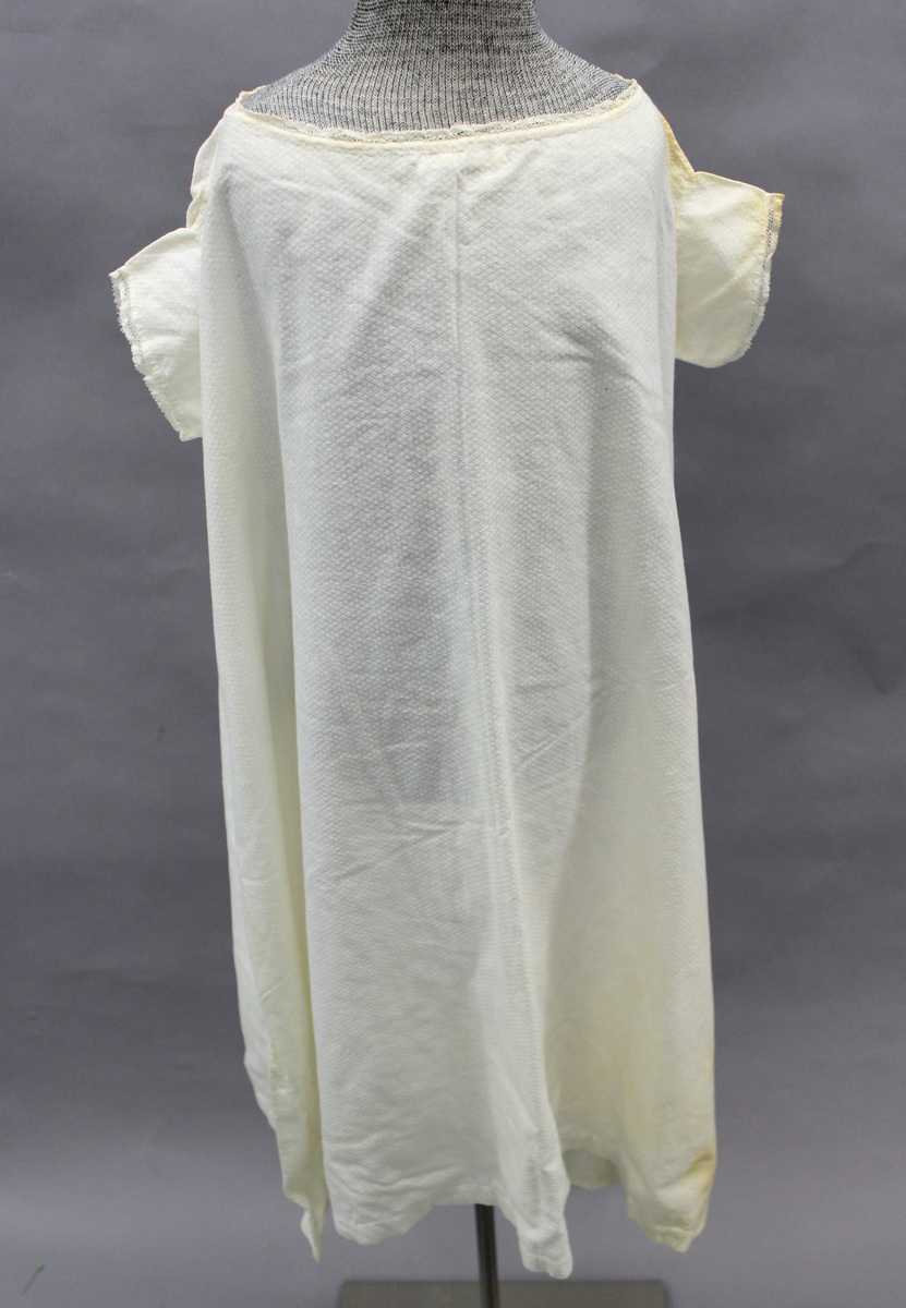 White novelty weave cotton child's dress; A-line; boat neck with lace trim; short sleeves; center back opening with drawstrings closure
