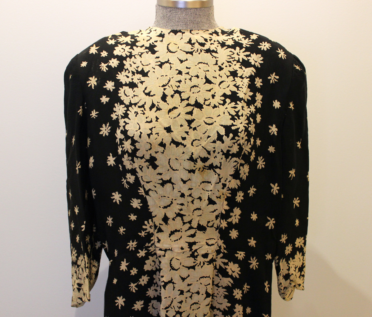Dark navy and tan floral long dress. Center-front panel, round neck. Three-quarter length sleeves. Padded shoulder pads. Metal zipper at center-back with hook and eye.