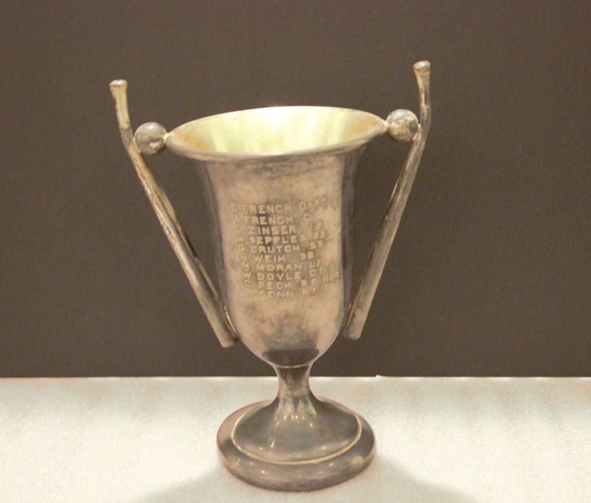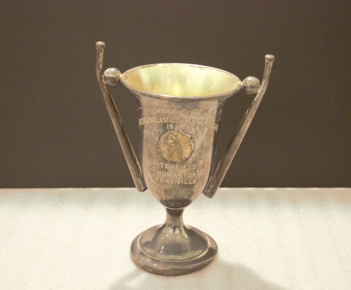 Metal goblet-style trophy for baseball, 1926. Engraved picture of baseball player in front center. Above it, engraved, "WEST CONN. / INTERSCHOLASTIC BASEBALL LEAGUE / 1926" and below it, "LITCHFIELD / THOMASTON / TERRYVILLE". Engraved on back, "C. FRENCH, CAPT. P. / A. FRENCH, C. / J. ZINSER, 1B. / W. SEPPLES, 2B. / G. CRUTCH, S.S. / H. WEIK, 3B. / M. MORAN, L.F. / W. DOYLE, C.F..P. / C. PECK. R.F., MGR. / R. FENN, R.F."