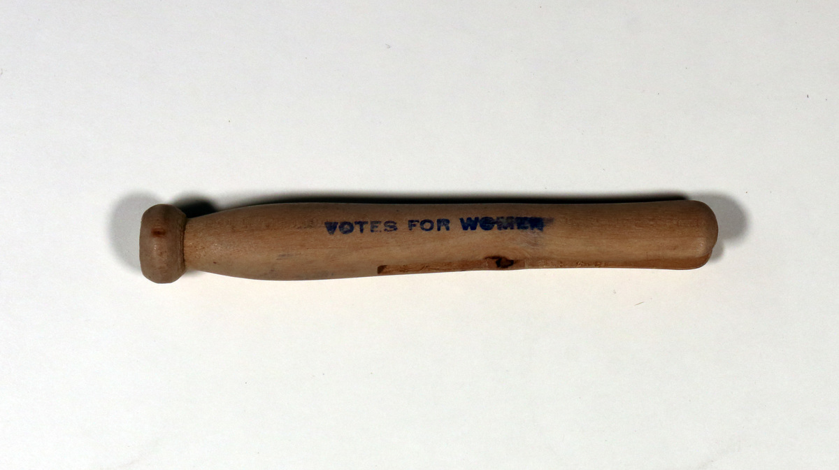 Wooden clothespin with round head and solid body, tapering slightly where it joins the head. 3" opening cut from wood to form the clothespin. Printed on opposite surfaces, in blue lettering, "VOTES FOR WOMEN." Old accession number written in pencil above one of the stamps.