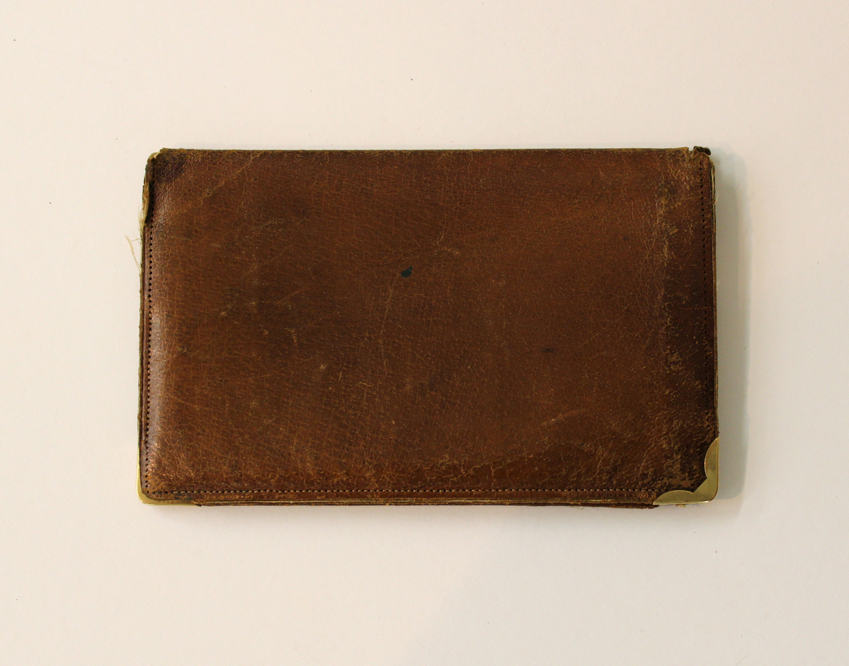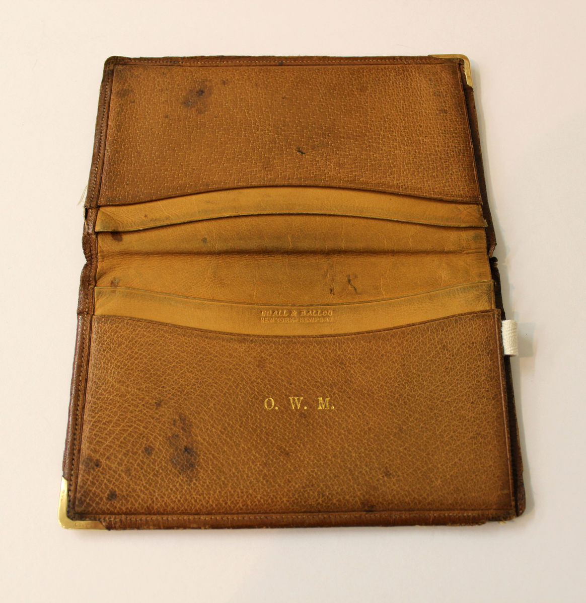 Medium brown leather men's single-fold wallet. Four interior pockets with one large pocket. Brass corner edges on front-left and back-right corners. Imprinted on inside pocket, "UDALL & BALLOU/NEW YORK - NEWPORT." Gold stamped initials on front-inside pocket, "O.W.M."