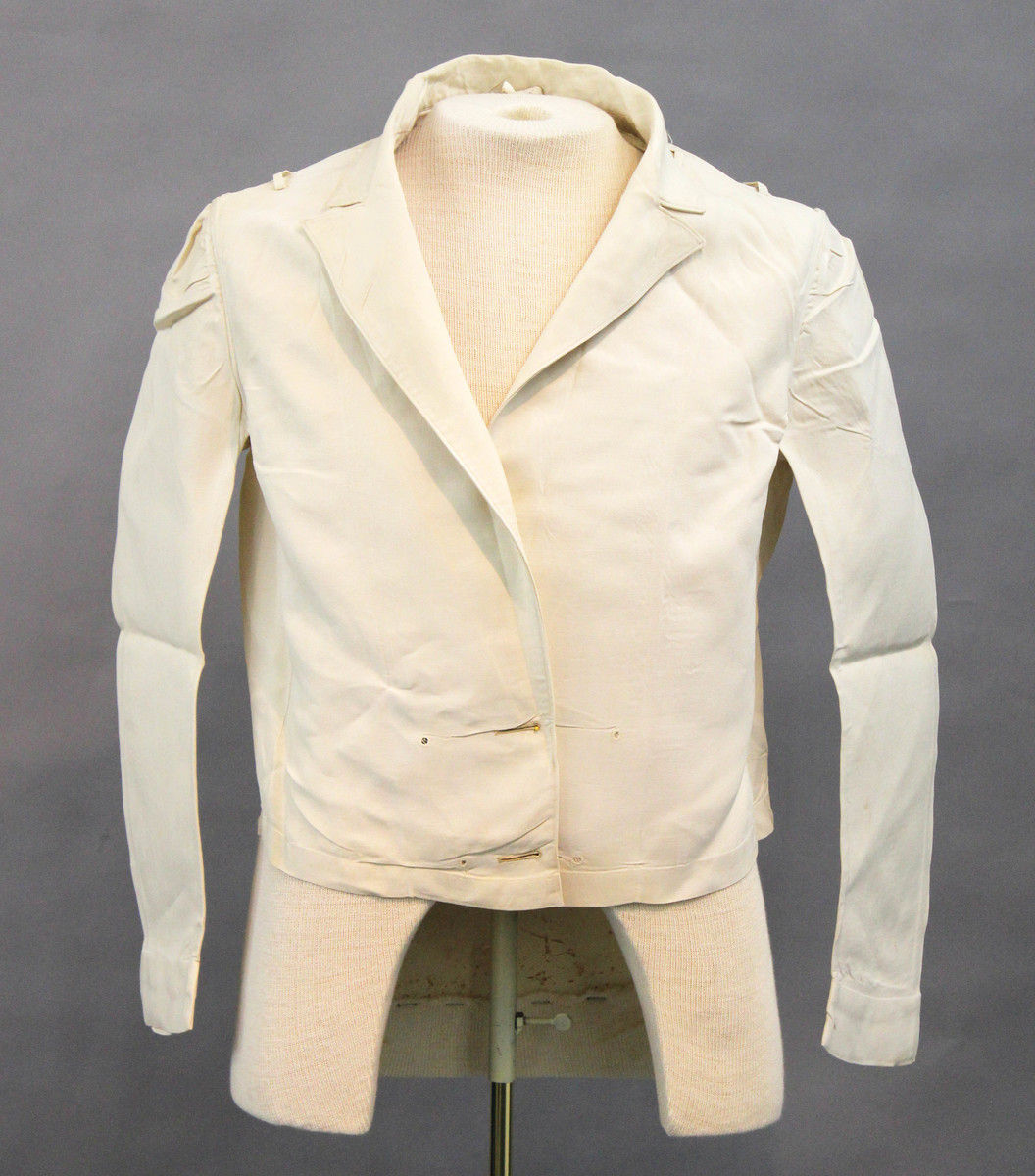 Off-white cotton canvas men's US Navy short dress jacket. Center front with four buttonholes and four stitched eyelets. Long sleeves with gathers at cap. Double loops at shoulders. Woven label at right side: "OFFICERS' UNIFORM SHOP / NAVY SUPPLY DEPOT / SOUTH BROOKLYN / NEW YORK / Name / Date / Ship anchor with chain and "OUR MISSION" on top of anchor and "SERVICE" at bottom of anchor