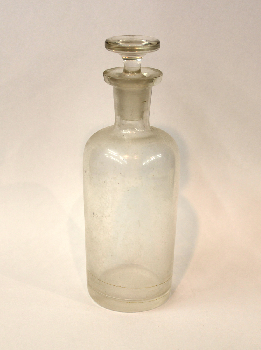 A - Clear glass medicine bottle, rounded bottom and slightly flared shoulders, with thin neck and flat rim. No labels or manufacturer's marks. B - Glass stopper for medicine bottle, flat top.