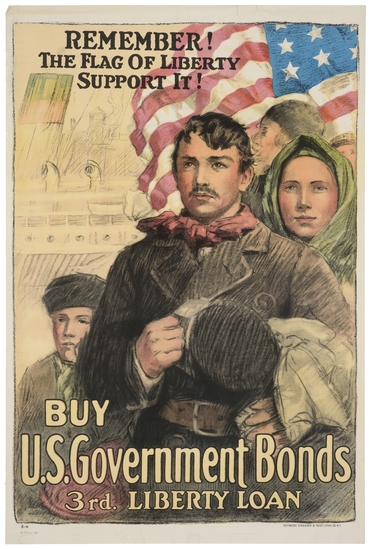 World War I poster. Steamship in background with American flag. Family of immigrants in foreground. The poster reads, "Remember! The Flag of Liberty/ Support it!/ BUY/ U.S. GOVERNMENT BONDS/ 3rd. LIBERTY LOAN."