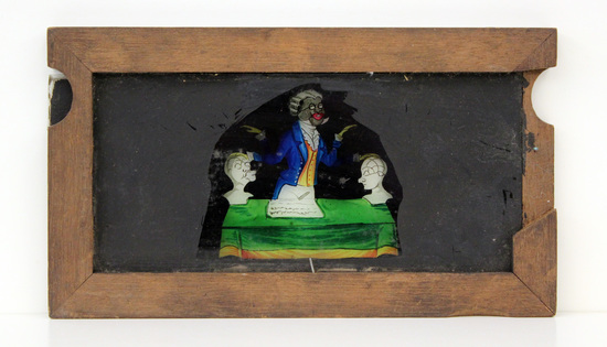 Magic Lantern slide in wood frame. Two glass plates, one on top of the other in frame. When plates are pulled across each other a man is seen lifting and placing his hands on phrenology models of the human head. The man is painted to wear a yellow vest, blue coat, cravat, glasses, and wig. "Phrenological Lecture" written in black ink on top of frame.
