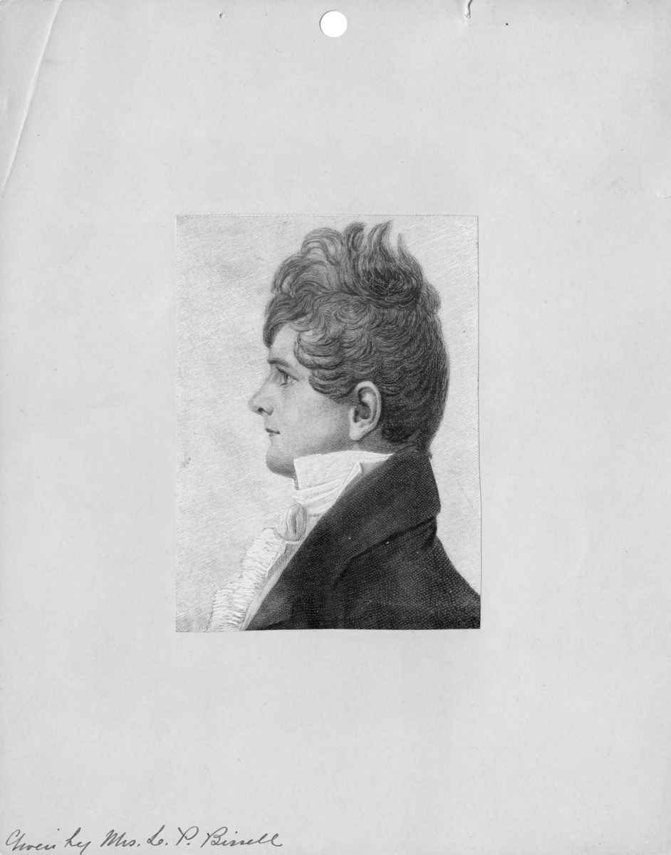 Engraving portrait print of John Mosby. Rectangular print, image of left-facing profile of young man. On back, label reads "JOHN MOSBY, AN ANCESTOR OF MRS. PURCELL/ From a portrait by St. Menim."